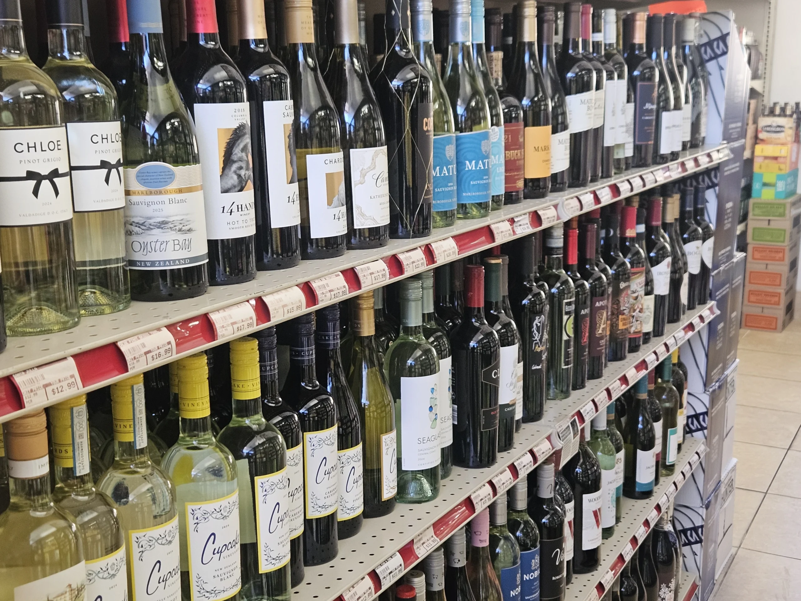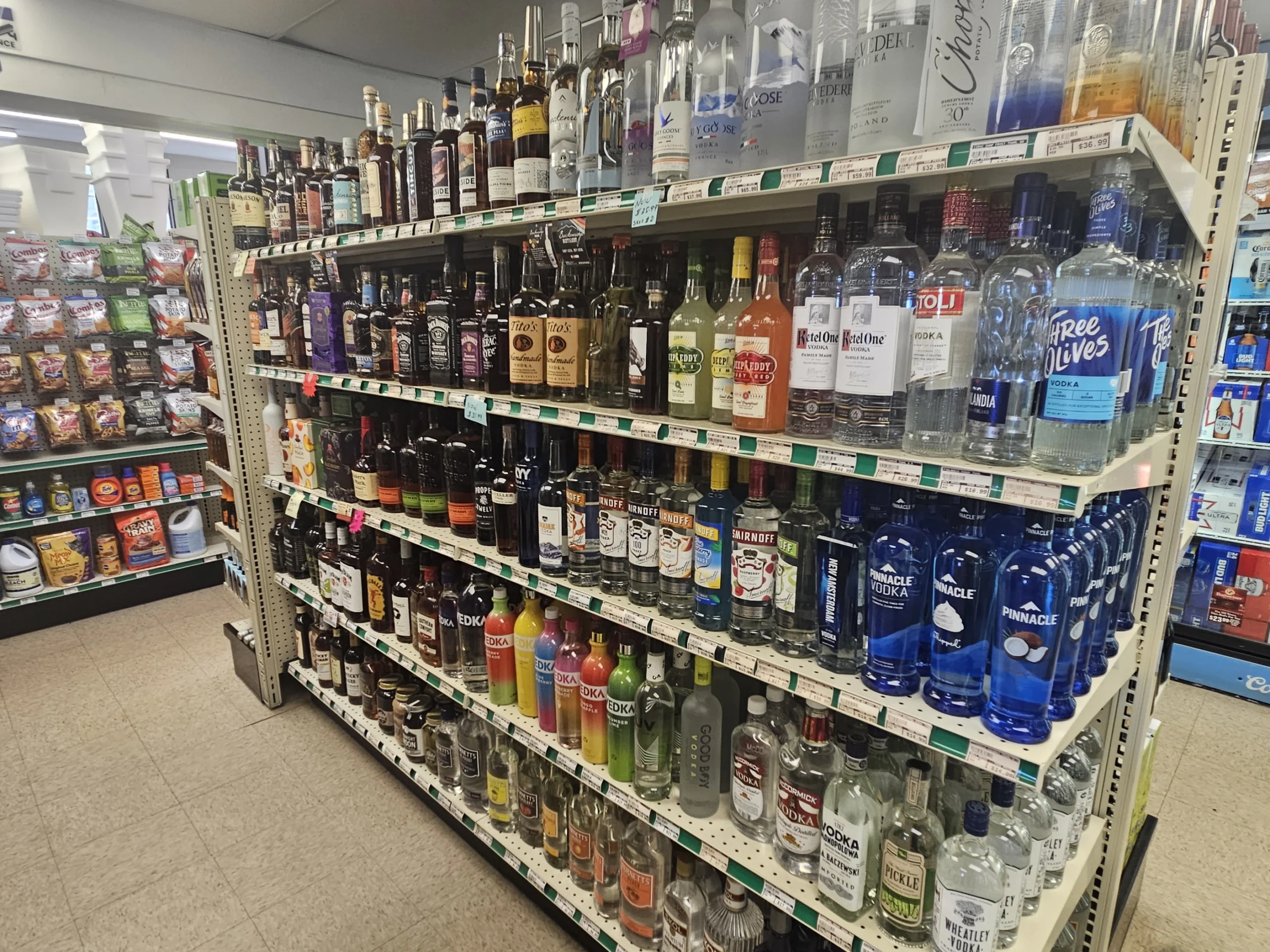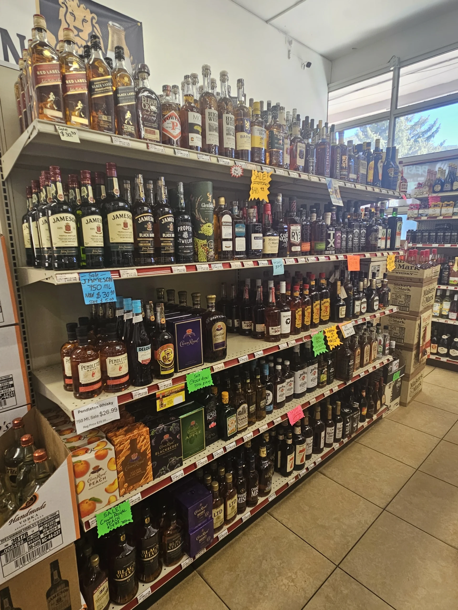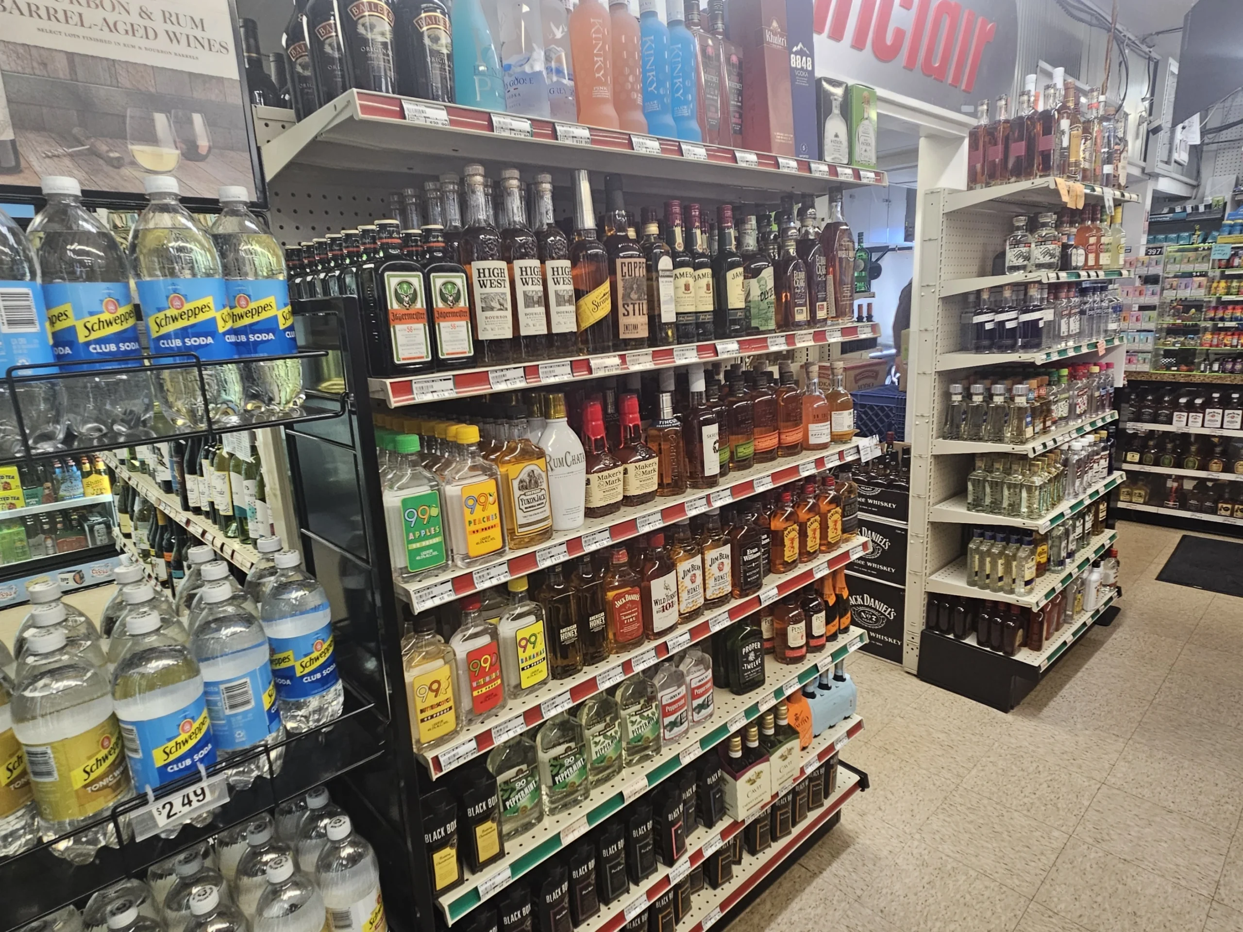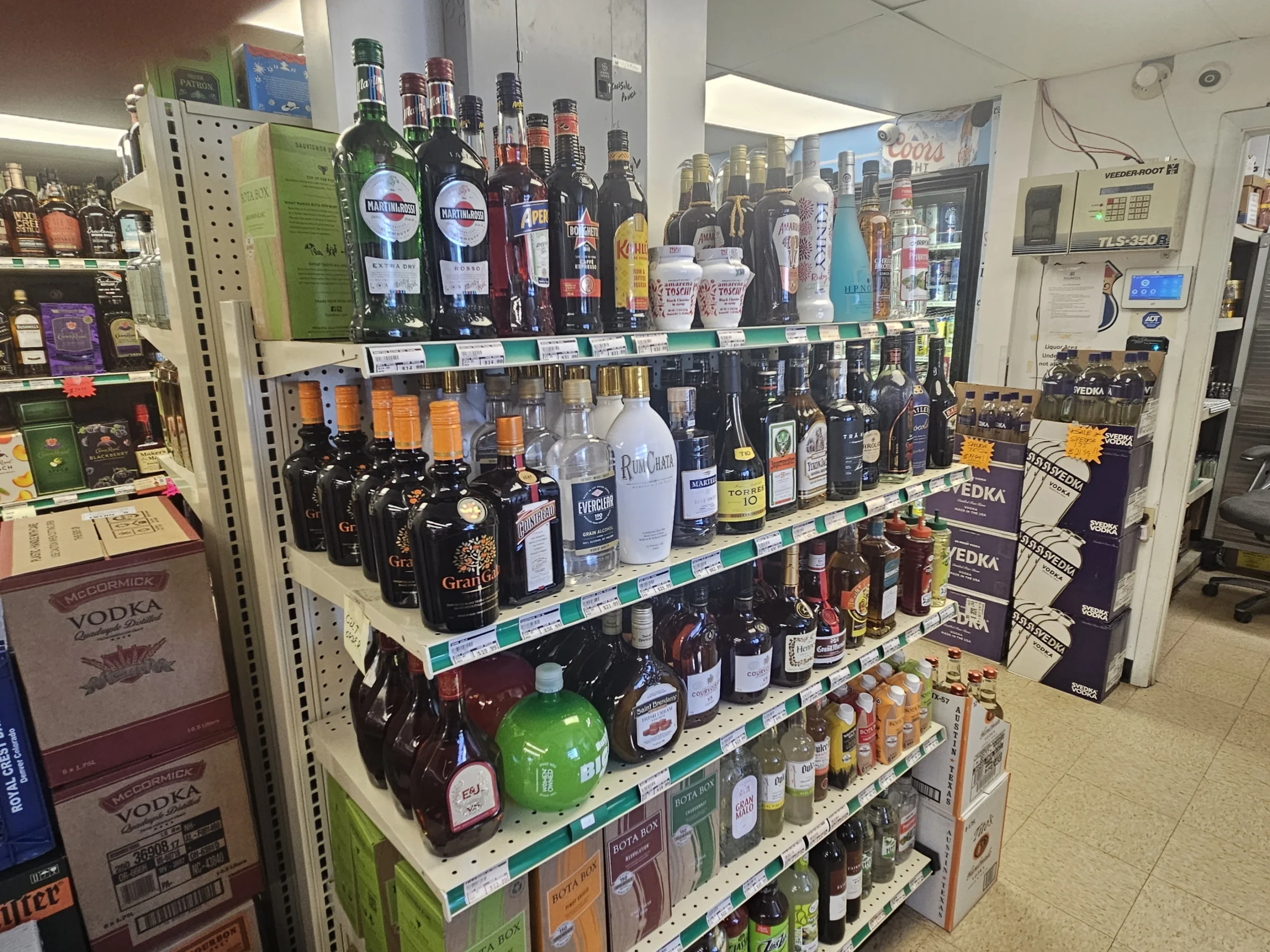 Perfectly located for easy in-and-out access. Full-size liquor store with extensive selection.